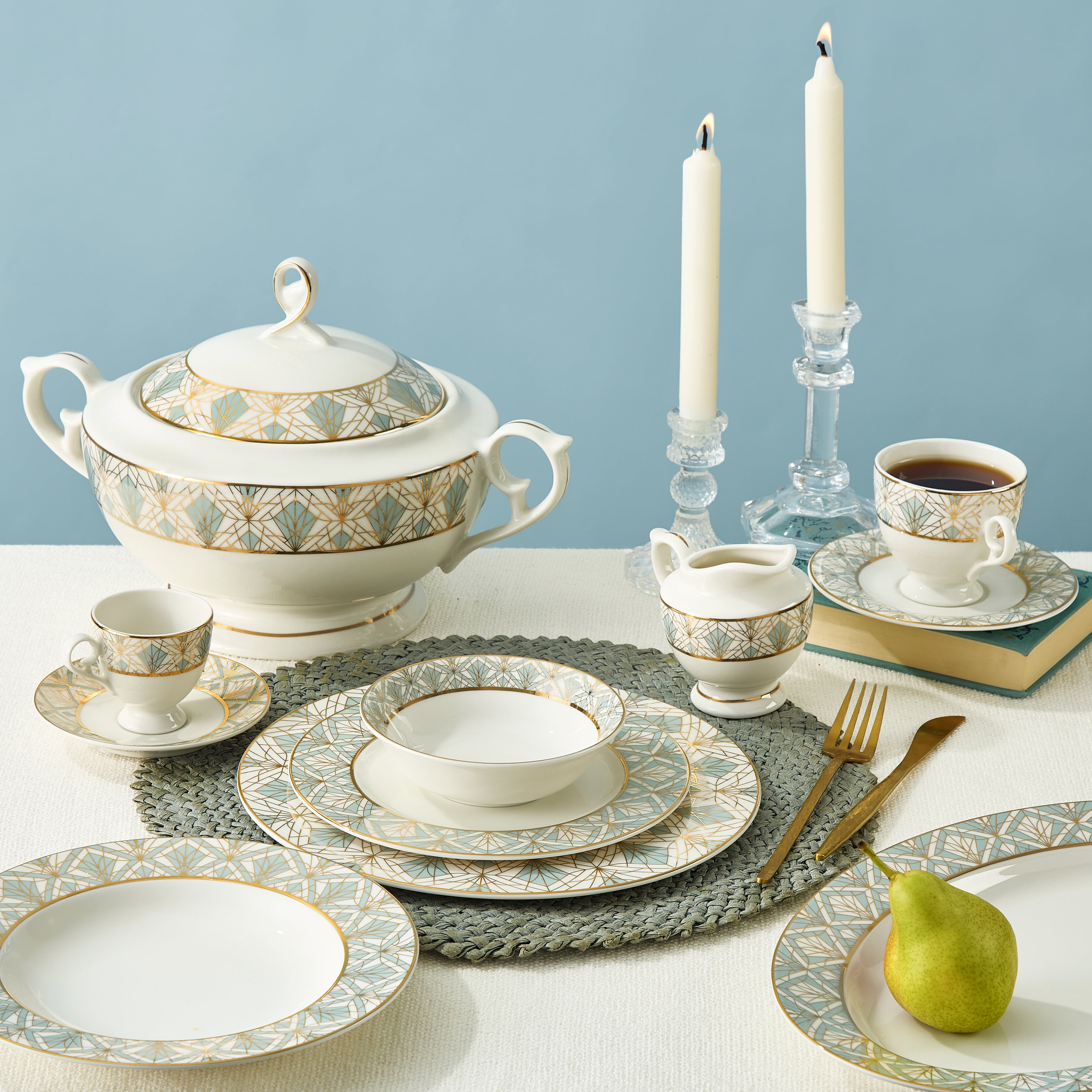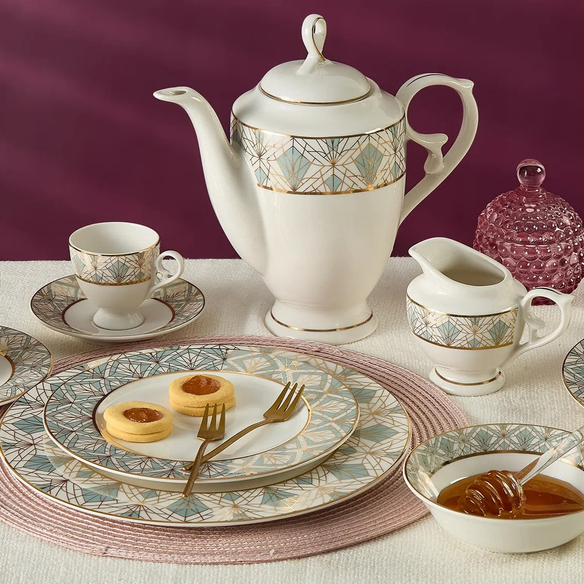 This elegant Fathy Mahmoud porcelain set features lavish Art Deco-style patterns in mint and gold, blending classic design with modern sophistication.