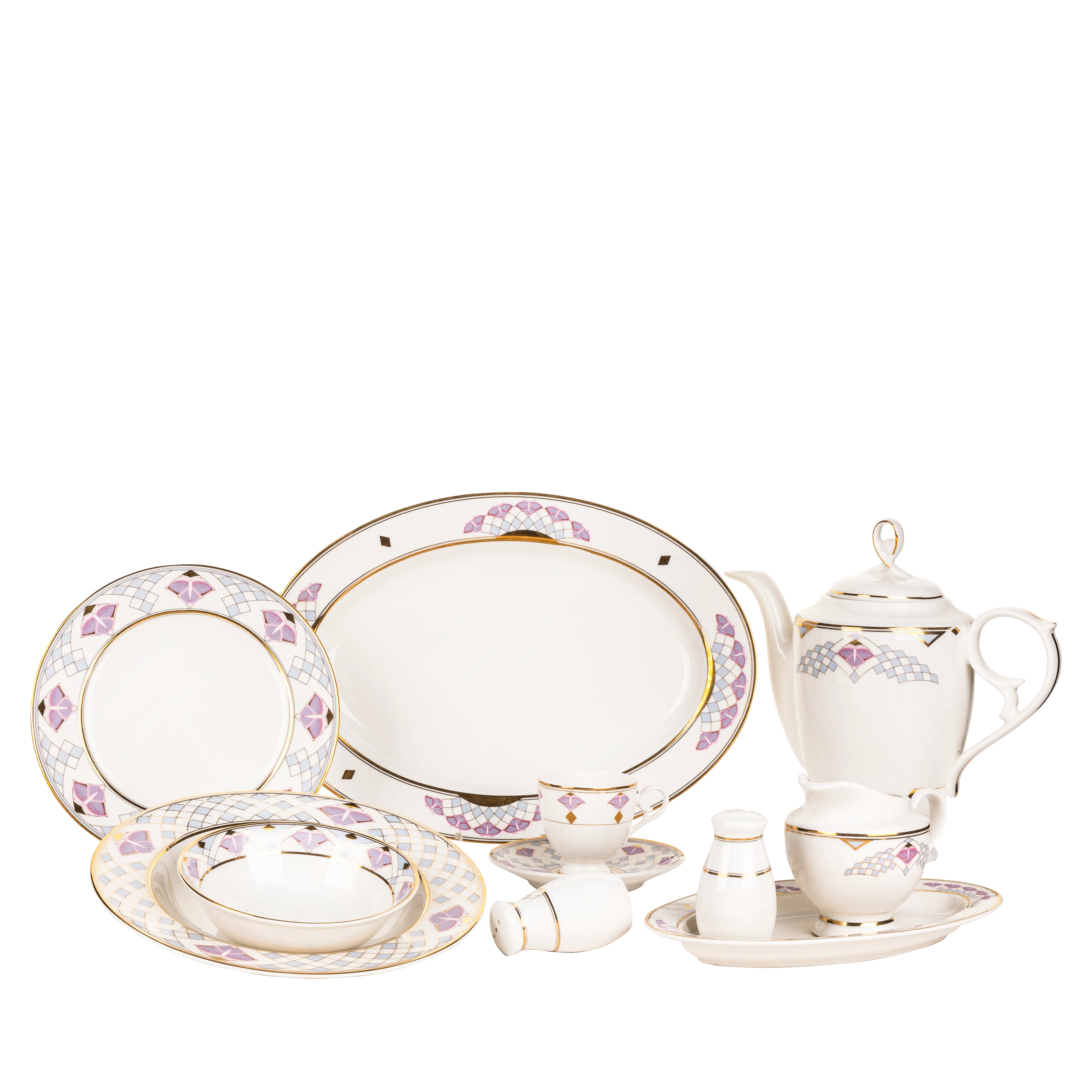 Delicate yet striking, the Butterfly Bloom set brings a refined elegance to the table. Featuring soft lilac and blush tones framed with intricate platinum accents, this set captures the lightness of fluttering wings in a graceful, geometric harmony. A timeless blend of modern beauty and classic sophistication.