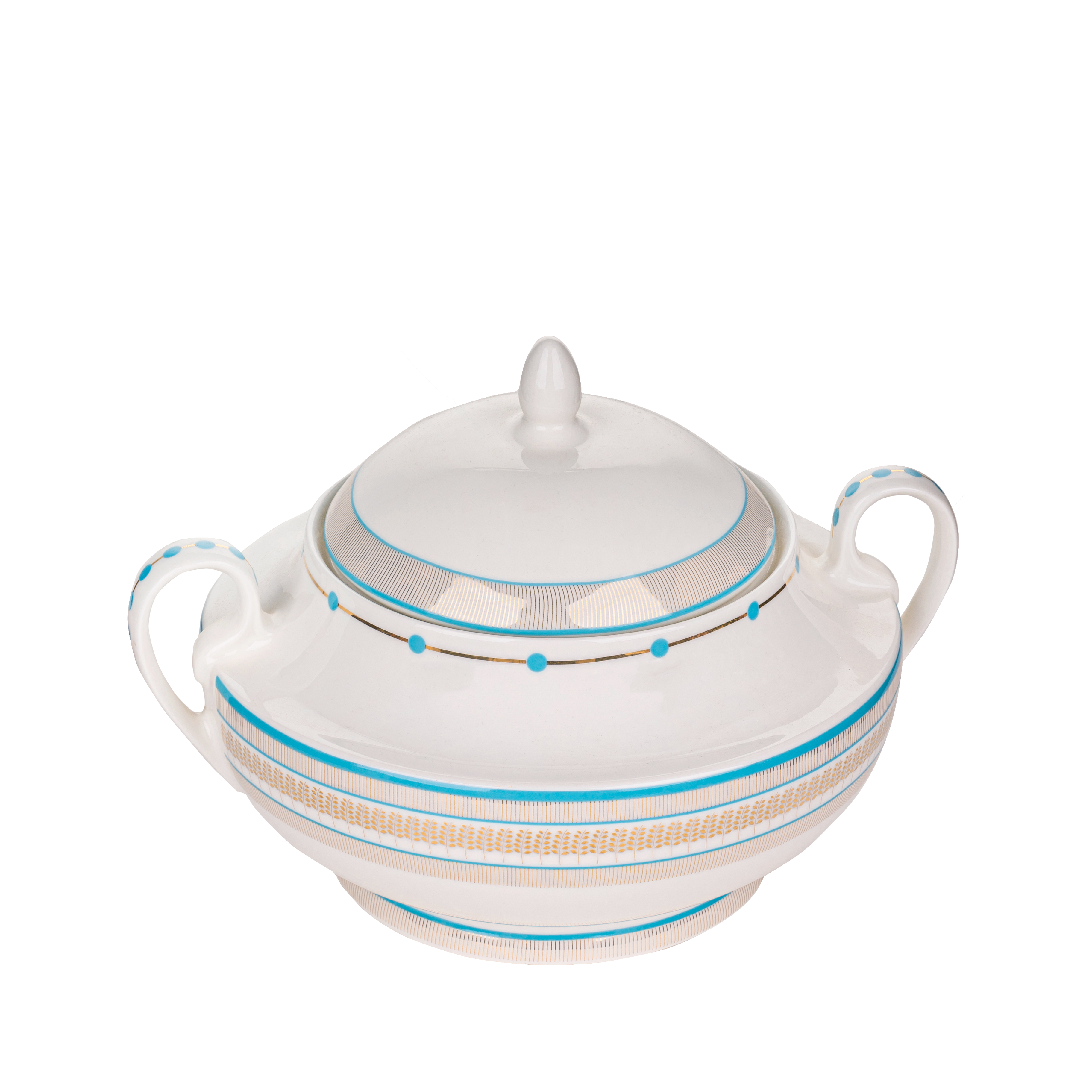 6 dinner plates 28cm, 6 dessert plates 22cm, 6 soup plates 23cm, 6 bowls, 6+6 teacup + saucer, 6+6 coffee cup + saucer, 1 round platter 33cm, 1 salad bowl 24cm, 1 oval platter, 2 pickle dishes, 1 salt, 1 pepper, 1+1 soup tureen + cover, 1+1 tea pot + cover, 1+1 sugar pot + cover, 1 creamer