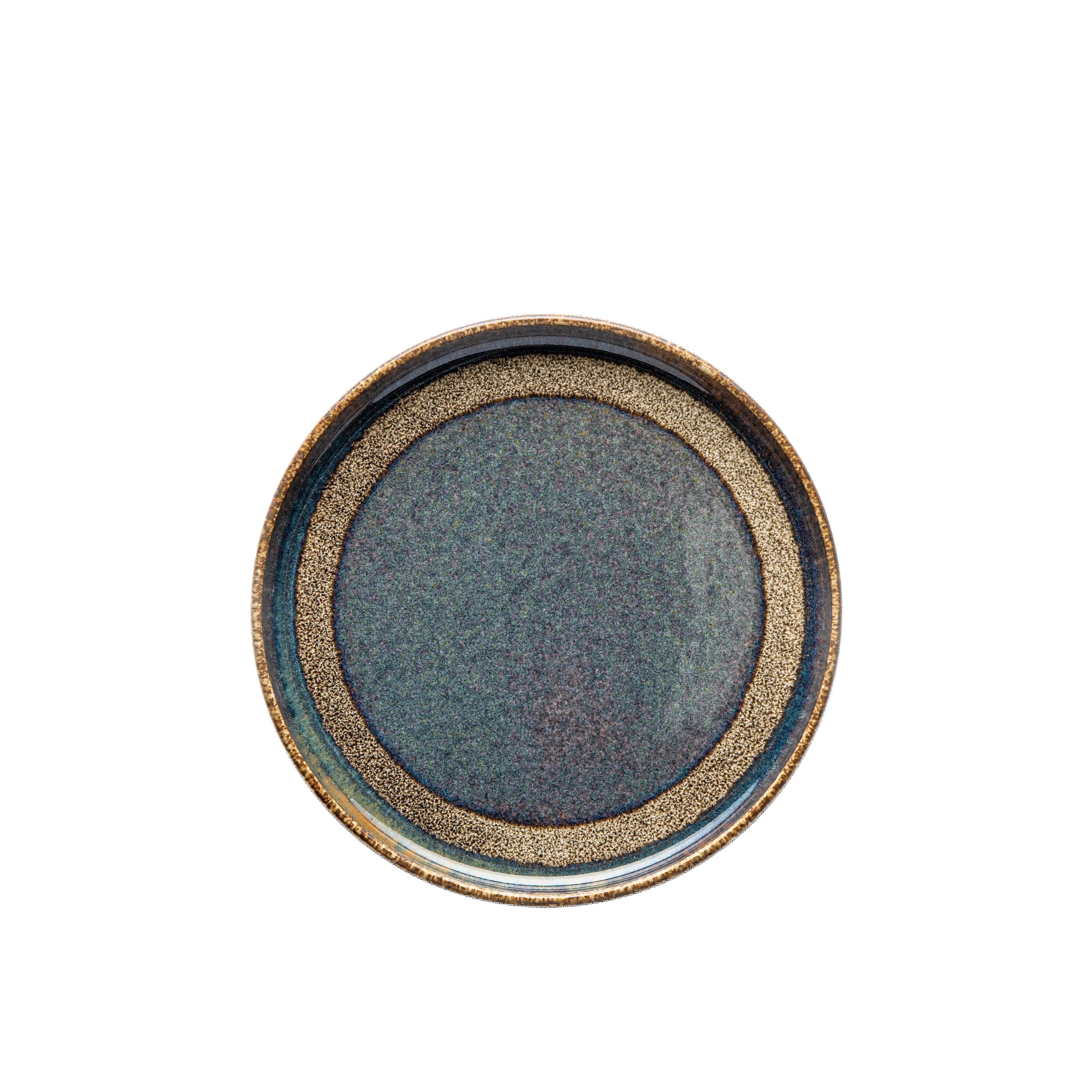 This Fathy Mahmoud porcelain set highlights blue, brown, and subtle purple tones, creating a striking palette. The high-edged shape merges modernity and practicality, making it both elegant and functional.