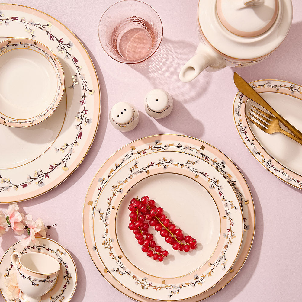 This charming Fathy Mahmoud porcelain set showcases a feminine design with salmon shades, lilac branches, and gold flowers in circles. A vintage country style in a classic frame.