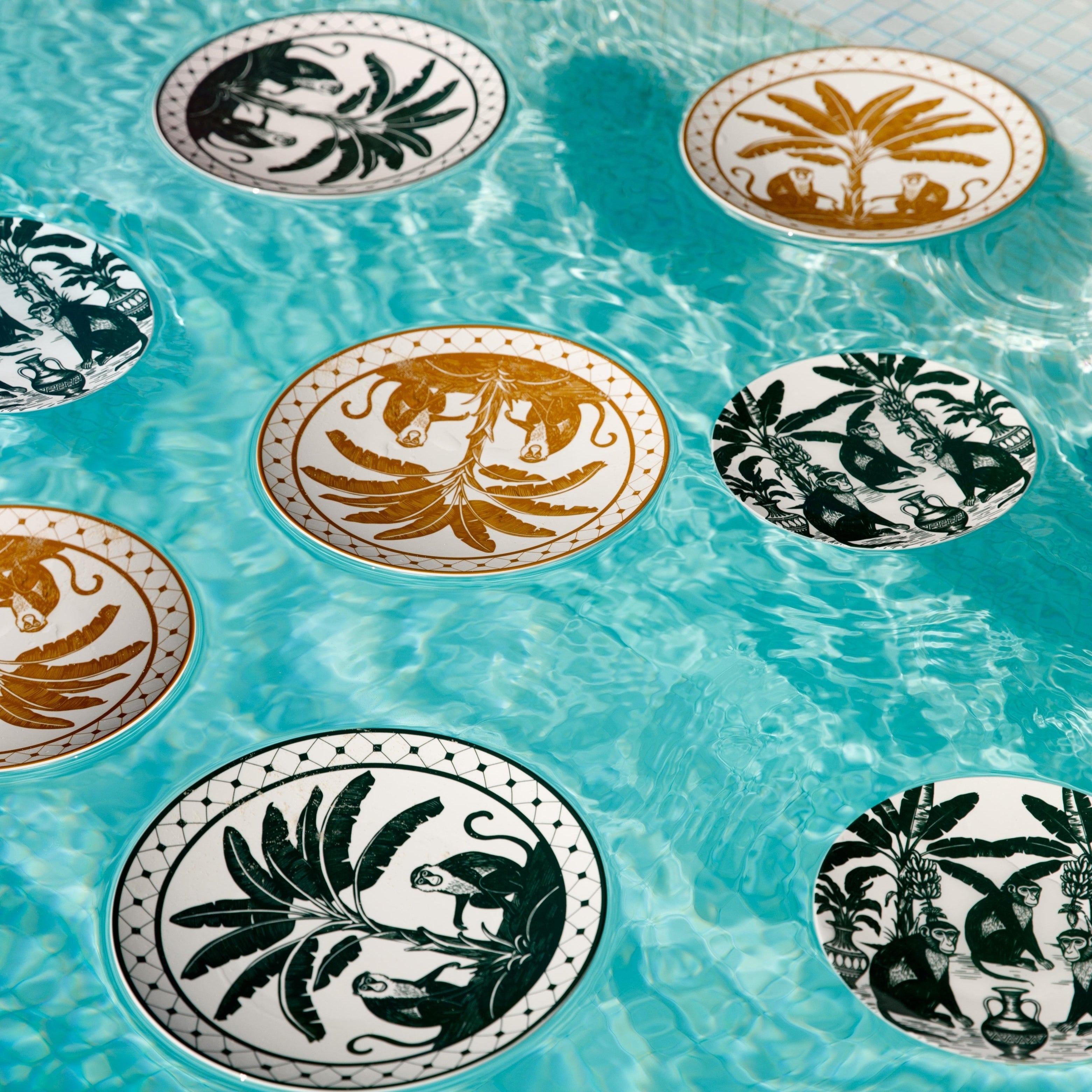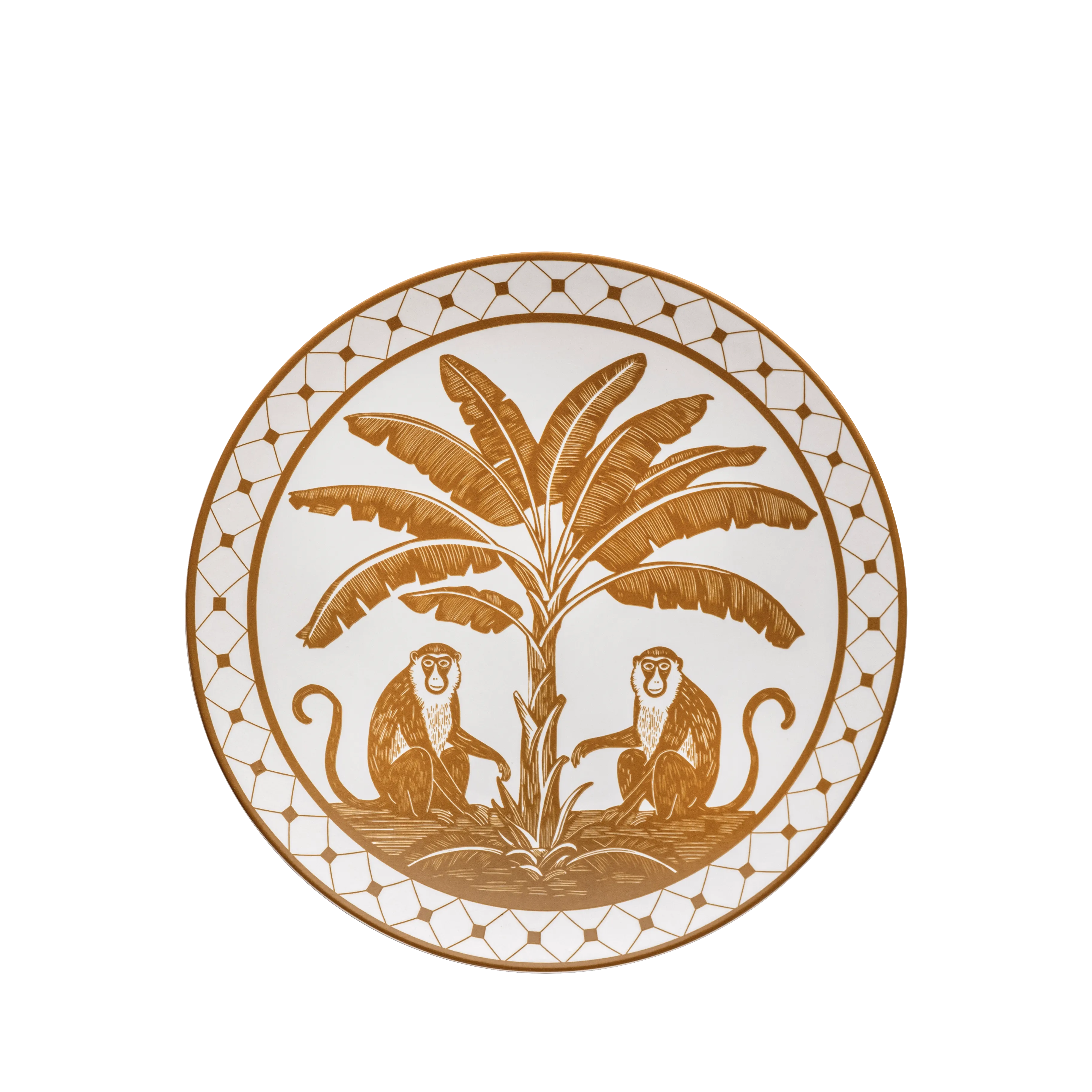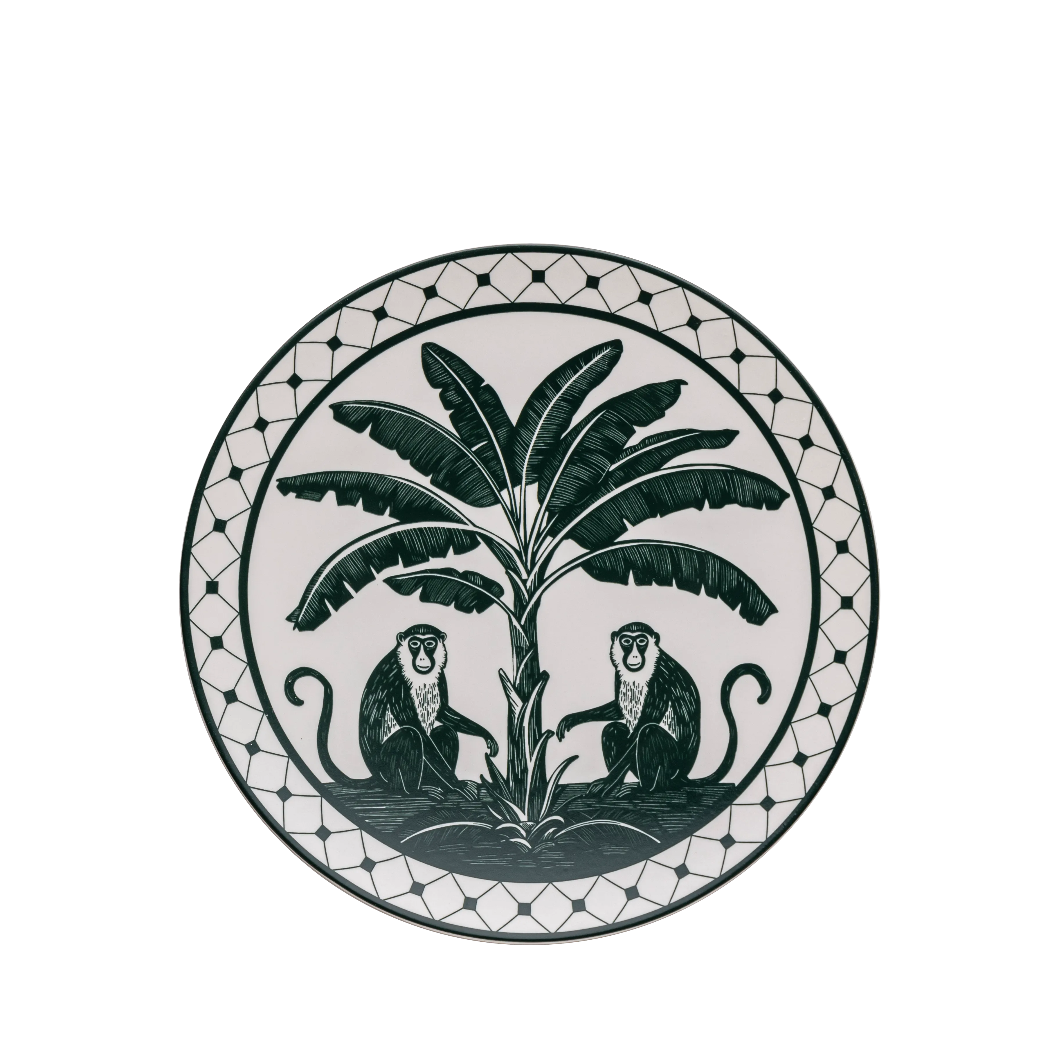 A playful nod to summer, this Fathy Mahmoud porcelain set features lively monkey scenes in rich green and ochre tones. It brings a tropical charm and golden detailing to any table.