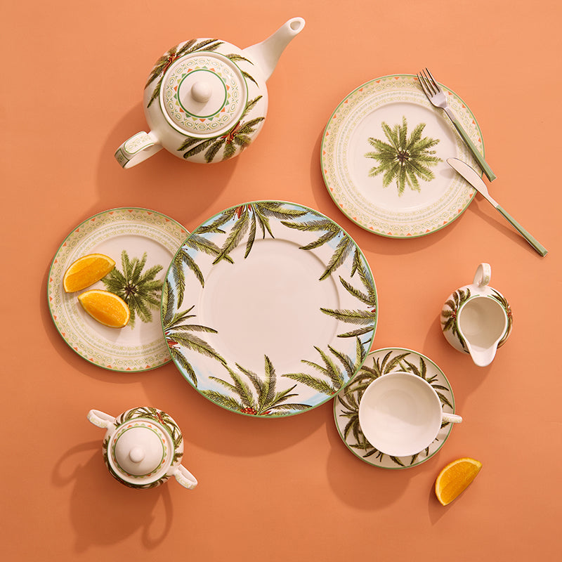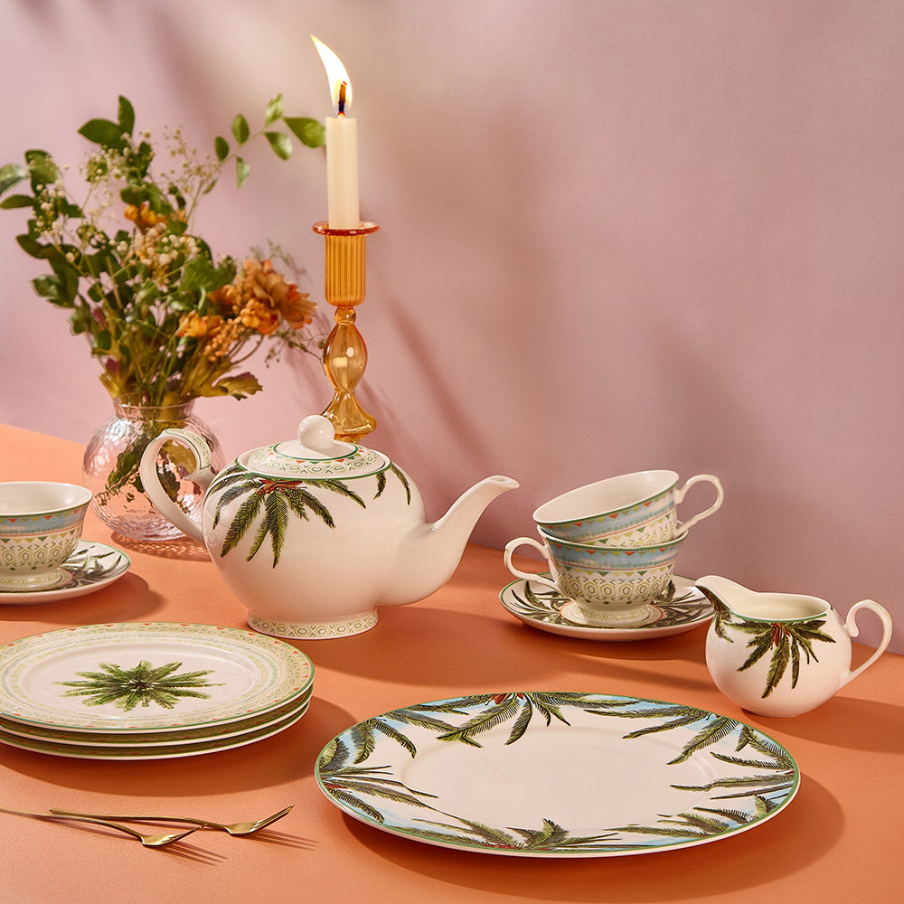 This tea set from Fathy Mahmoud porcelain celebrates oriental elements of Nubian arts, adorned with palm trees and botanical motifs. A folkloric design that merges tradition with artistic elegance.