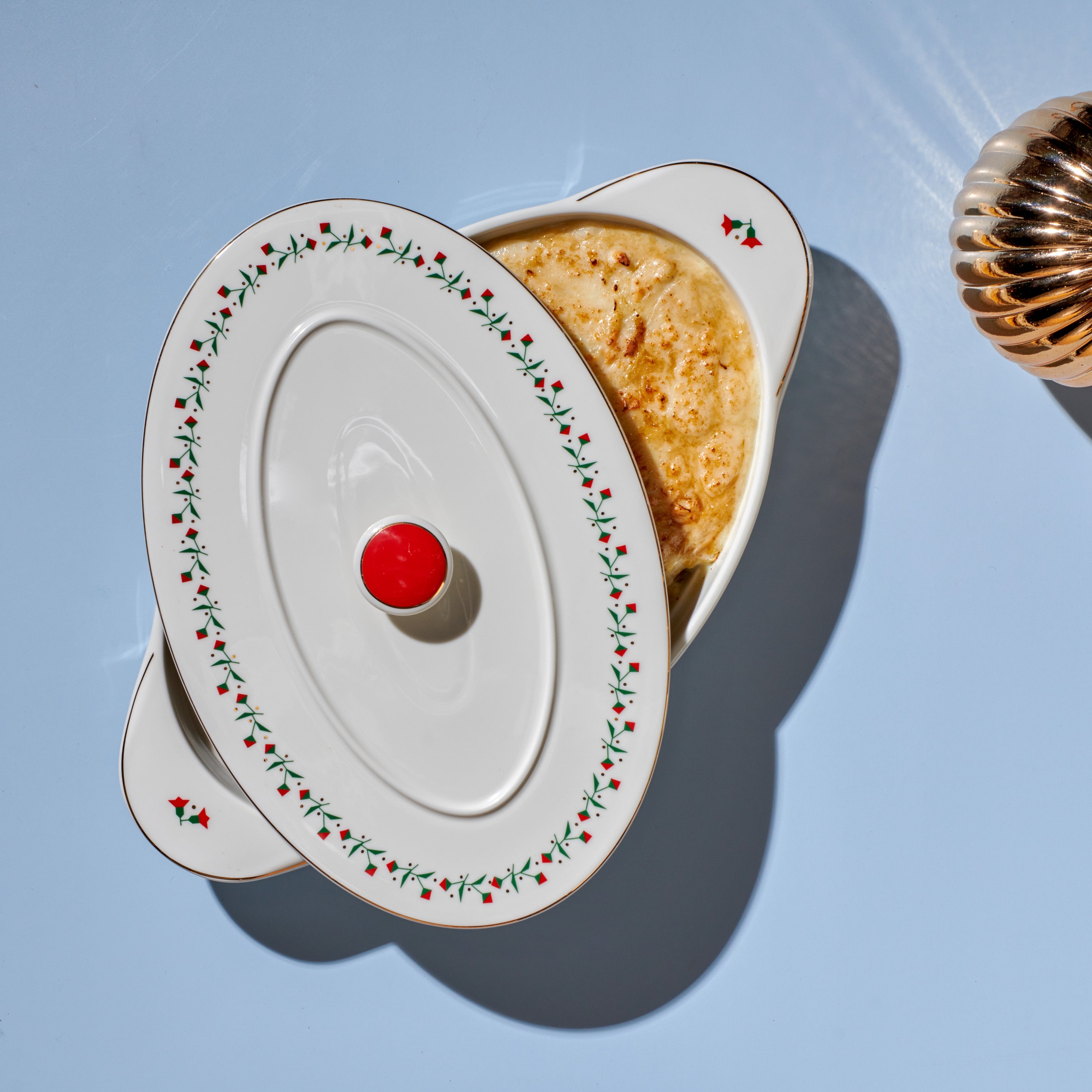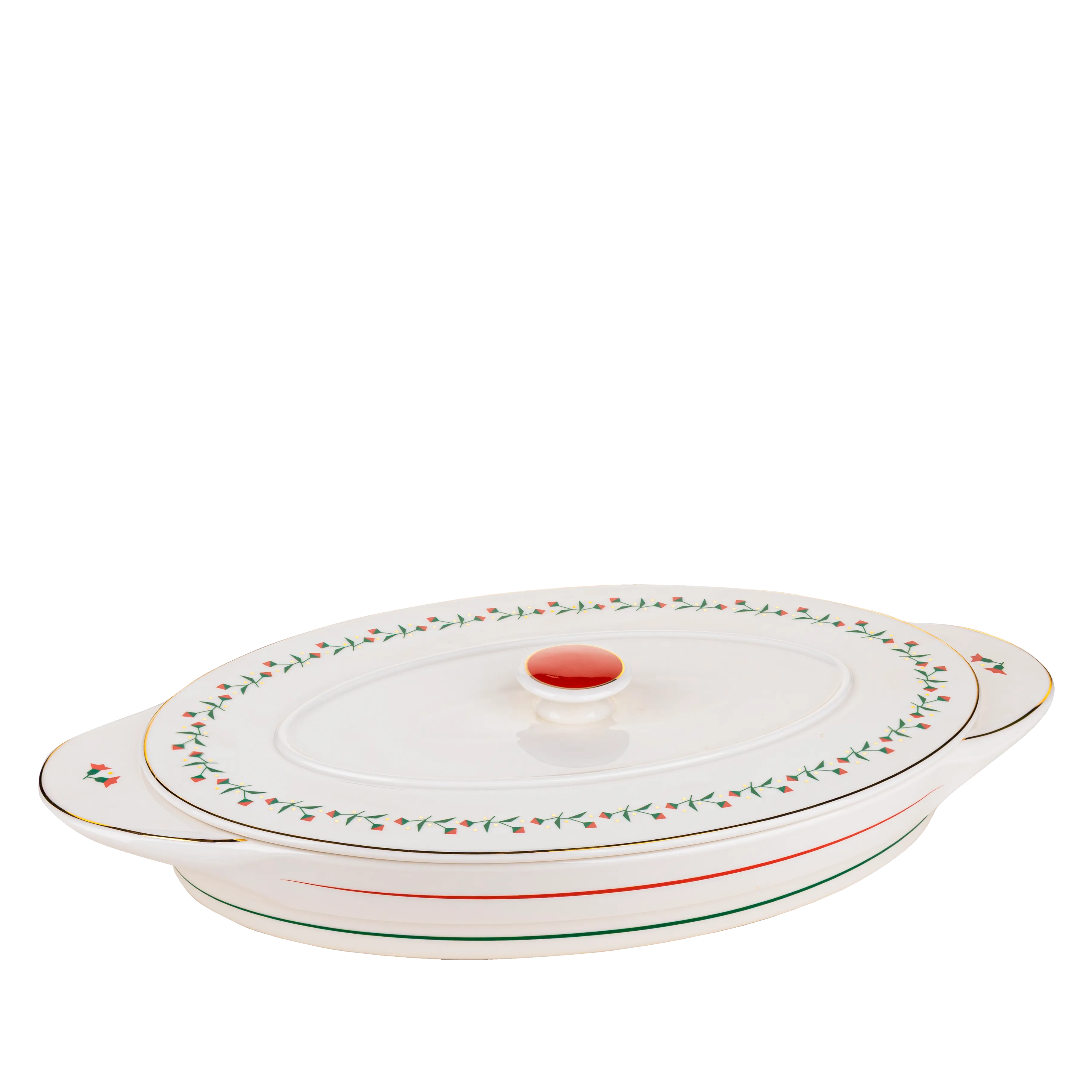 A festive serving piece adorned with delicate poinsettia details and subtle gold accents. Perfect for presenting warm dishes during Christmas gatherings. Tip: Pair it with our Poinsettia Lights Dinner Set for a complete holiday table.