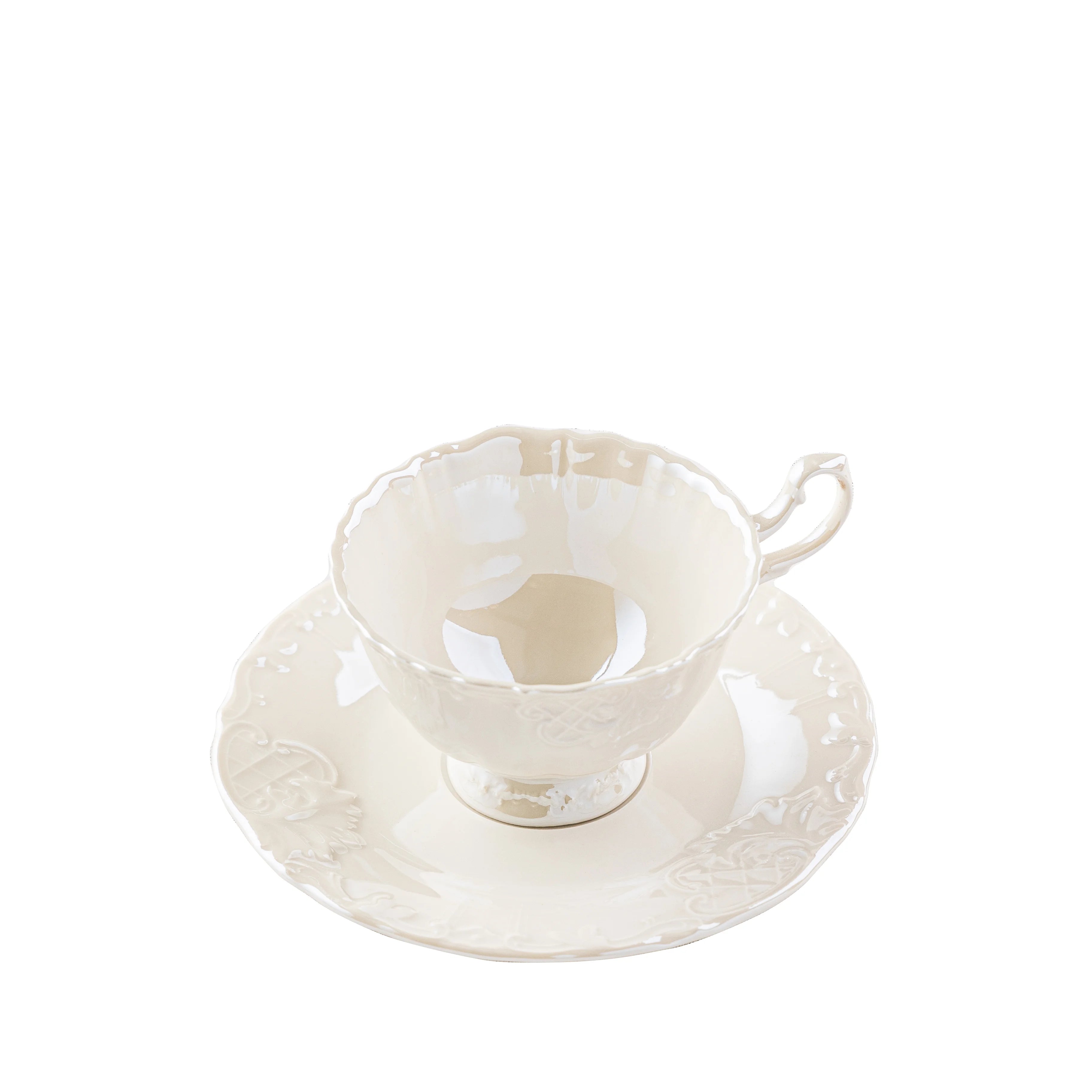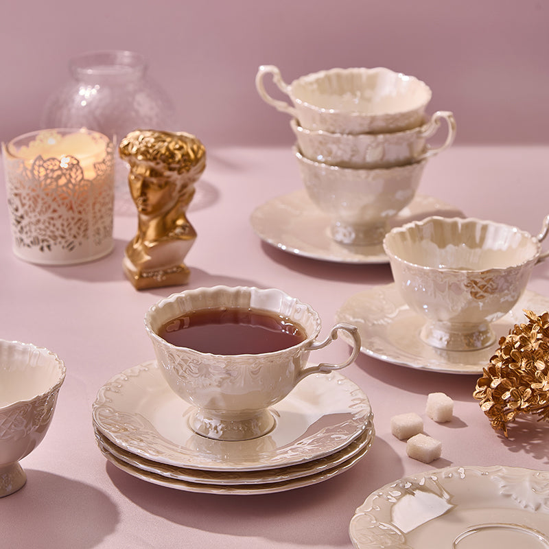 This timeless Fathy Mahmoud porcelain tea set features teacups in a stunning pearl white color, exuding a classic whimsical charm. Enhanced with a PVD finish, it combines elegance with modern sophistication.