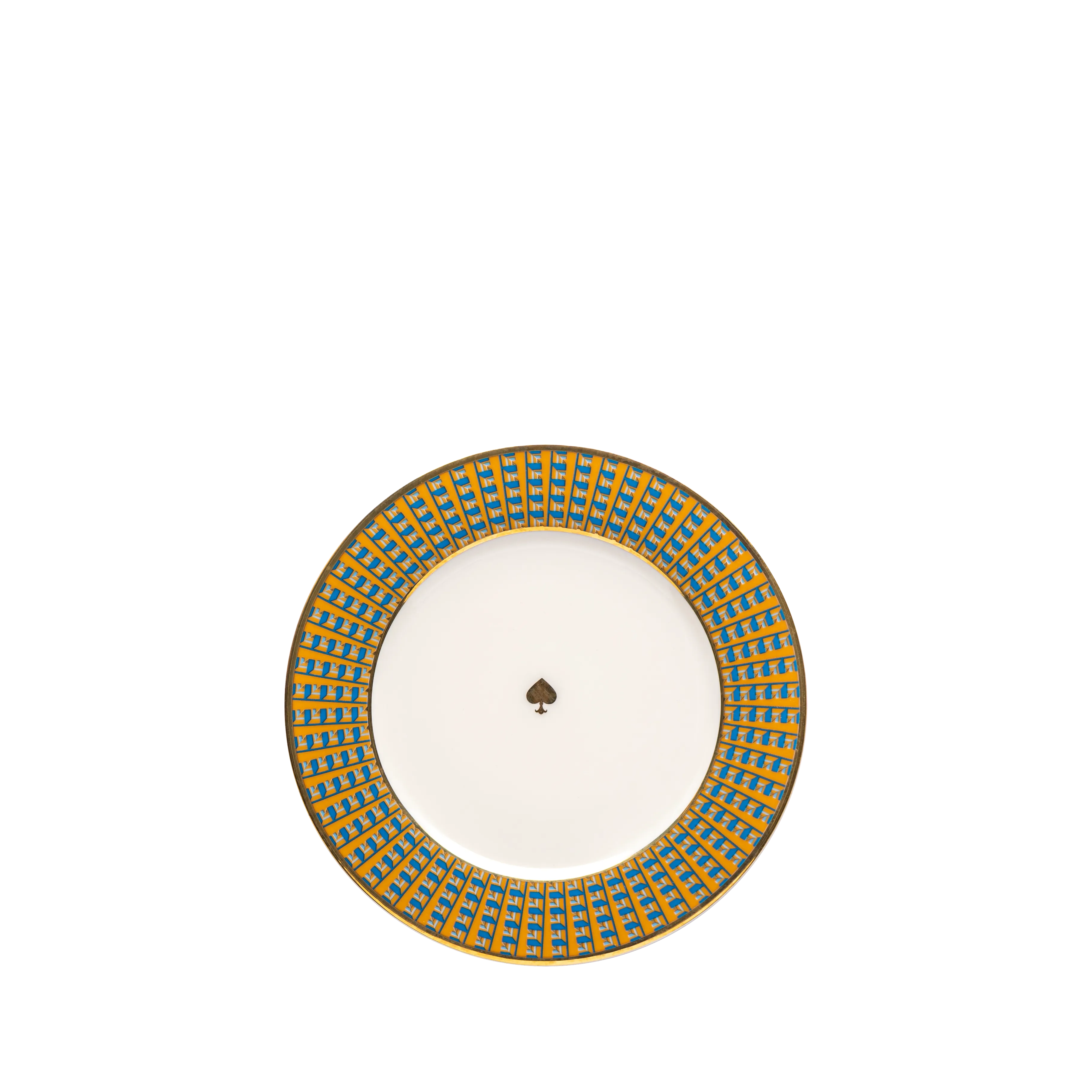Inspired by the elegance of playing cards, the Spade dinner set from Fathy Mahmoud porcelain blends bold color, intricate edge patterns, and refined gold accents. A playful yet sophisticated statement for the modern table.