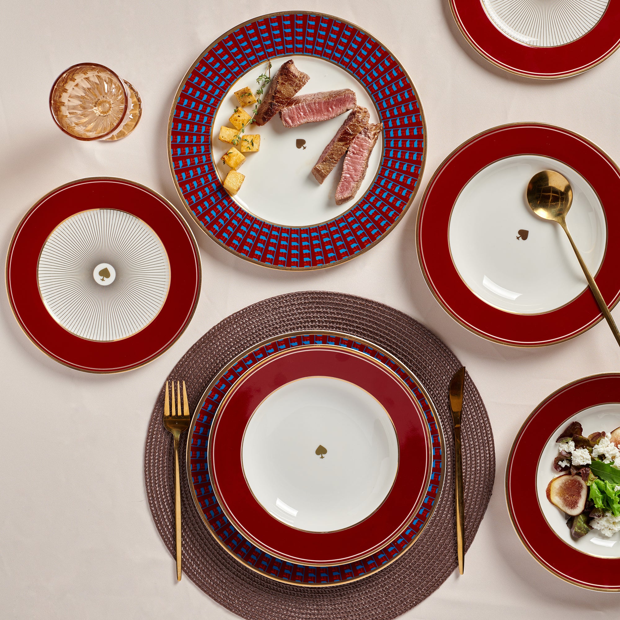 Deep burgundy hues meet intricate patterns and subtle gold detailing in this refined Spade dinner set by Fathy Mahmoud. A rich, elegant take on a timeless classic.