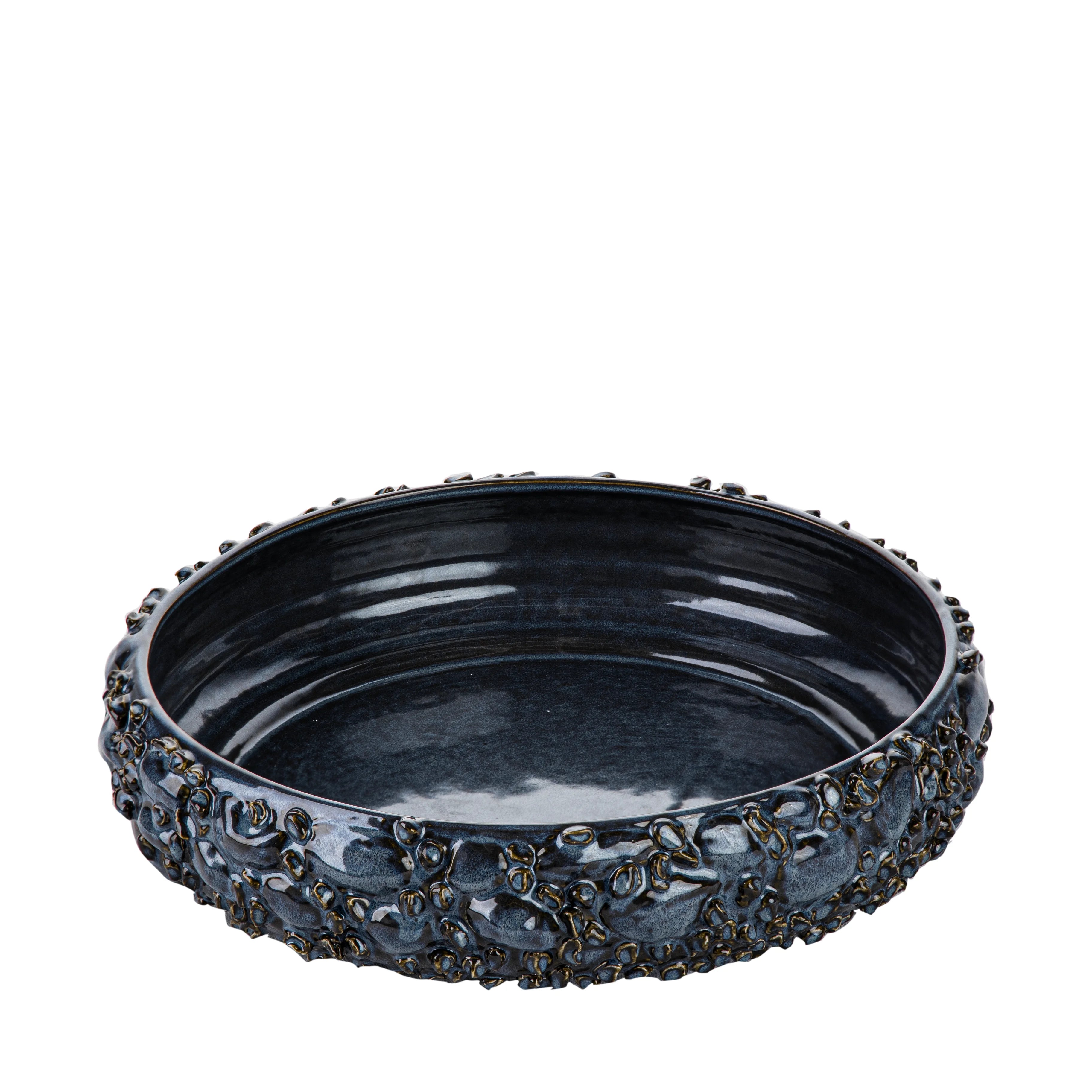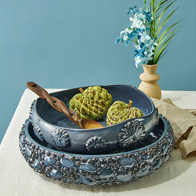 This beautiful handmade tagine showcases a blue jeans reactive glaze finish. The intricate exterior is adorned with individually crafted and hand-glued rock-like details, adding texture and uniqueness to every piece. A stunning blend of artistry and functionality.